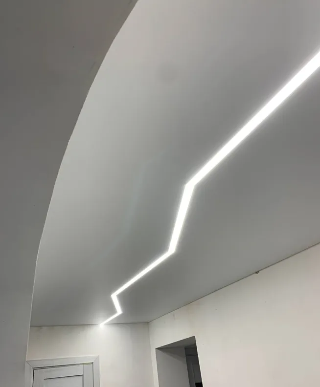 Специальный профиль, встраиваемый в натяжной потолок, позволяет создавать светящиеся геометрические фигуры, линии и кривые.